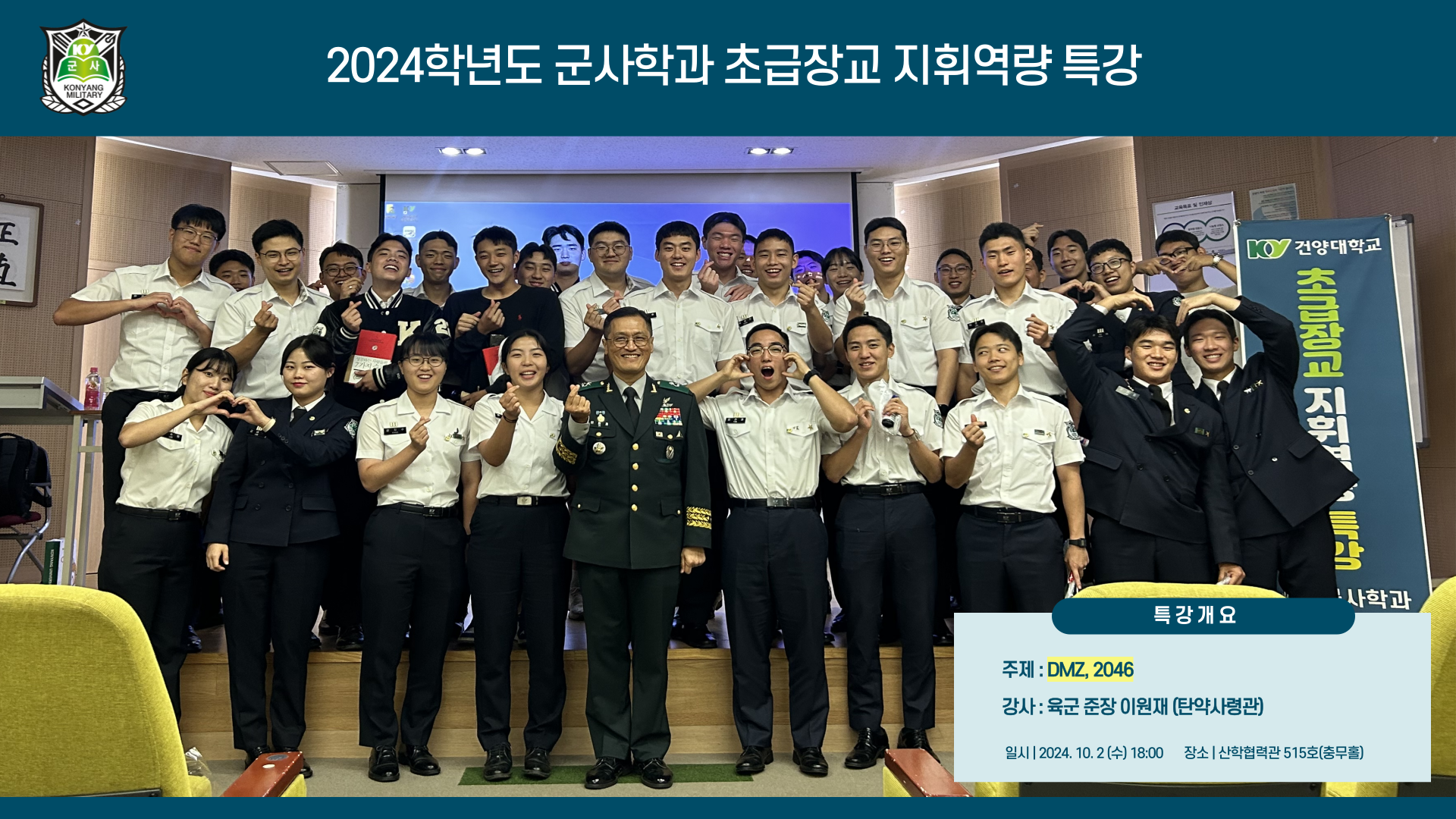 [4회차 특강] - 일자 : 2024.10.02(수) - 주제 : DMZ, 2046 - 강사 : 육군준장 이원재 (탄약사령관) |