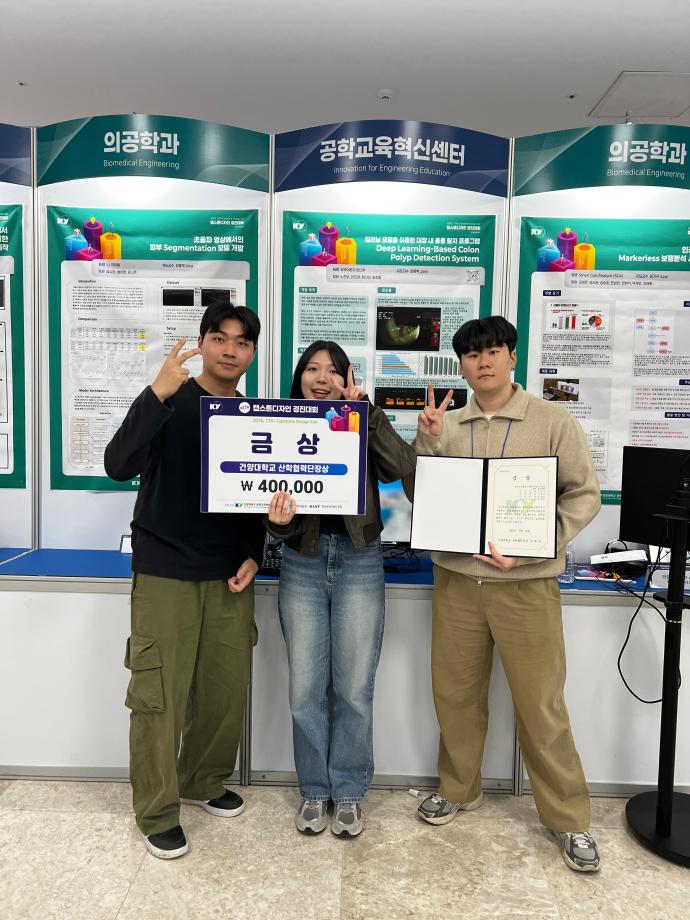 17회 교내 캡스톤디자인 경진대회에서 우리과가 대상, 금상, 장려상 3팀이 선정되었습니다. 학과 캡스톤디자인에서 열심히 해준 결과가 나온것 같아 기쁘네요. 다들 축하드립니다. 다들 서로에게 축하해주면 좋겠습니다~ 대상: 이예찬, 김시온, 조용준 (지도교수: 태기식) 금상: 노진우, 안진경, 정다인 (지도교수: 최동혁) 장려상: 전소연, 이채령, 박지희 (지도교수: 최동혁) 장려상: 허수명, 김병수, 이준희 (지도교수: 오도창) 장려상: 이축복, 양혜진, 한현지 (지도교수: 태기식) |