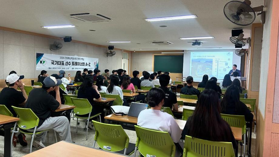 [2024학년도 스포츠학과 전문가 특강] 2024년 6월 5일 진천선수촌 체력지도위원회 천O호 강사님께서 오셔서 특강을 진행하였습니다 구단 선수 트레이너뿐만 아니라 국가대표 선수 트레이너라는 더 큰 꿈을 가지고 나아갈 수 있도록 도와주는 특강이었던 거 같습니다!