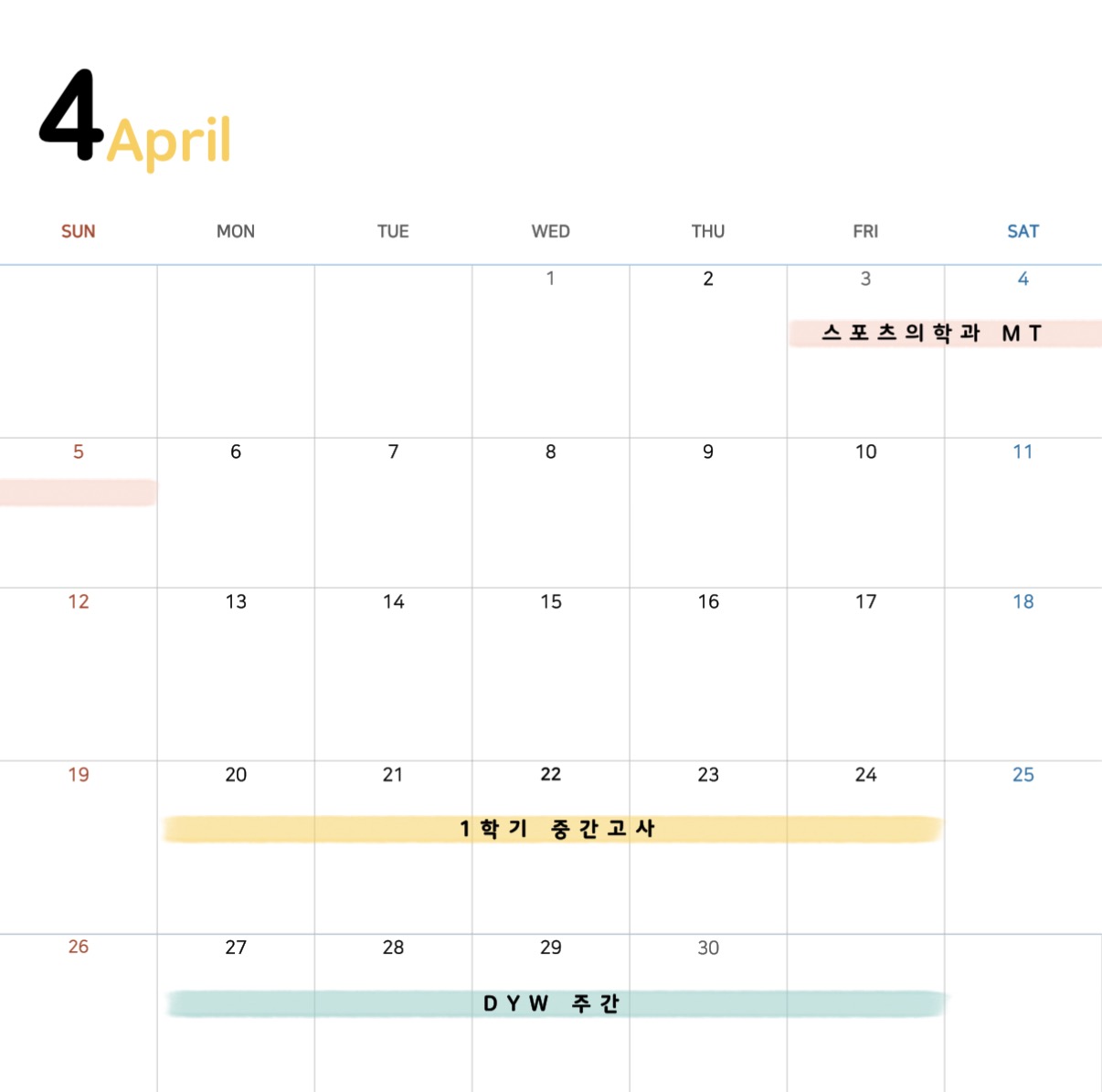 건양대학교 4월 학사일정 안녕하세요 건양대학교 스포츠의학과 학생회입니다 다들 새학기를 잘 보내고 계신가요? 어느덧 3월이 빠르게 지나가고 따스한 계절이 다가오고 있네요! 4월에 준비된 스포츠의학과 MT에서 신나게 놀고 모두 첫 중간고사 잘 준비해서 좋은 결과 받기를 응원하겠습니다! *4월 3~5일 스포츠의학과 MT *4월 20~24일 중간고사 *4월 27~30일 DYW 기간