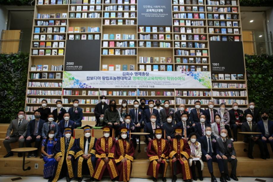 이날 김희수 명예총장에게 직접 명예박사 학위를 수여한 왕립프놈펜대학 쨋 지어리 총장은 “김희수 명예총장의 공중보건 및 교육 분야에서의 공헌은 국제무대에서 높이 인정받고 있으며 우리 대학은 학위수여 법적 규정에 따라 엄격하게 검토한 결과 만장일치로 명예박사학위 수여를 승인했다”고 밝혔다.